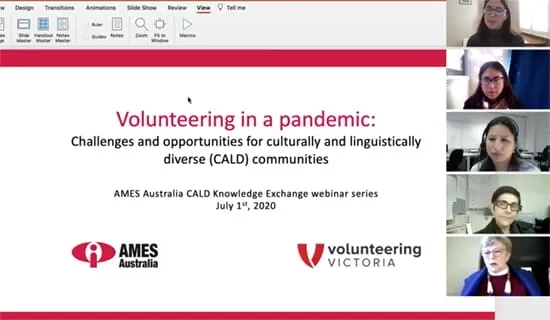 Facilitated by AMES Australia Research Officer Carissa Gilham, the session included information on: volunteering trends within CALD communities based on recent AMES research; why volunteering can be a valuable activity for people from a CALD background; how volunteering may be changing during COVID-19, and how we can support CALD communities in emerging forms of volunteering, and; what local can do to help people find out about volunteering opportunities and set up and formalise their own volunteer programs.