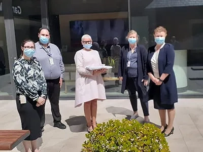 AMES Australia CEO Cath Scarth accepted the donation from Cabrini Health Head of Mental Health and Outreach Sharon Sherwood at the Cabrini Hospital in Malvern.