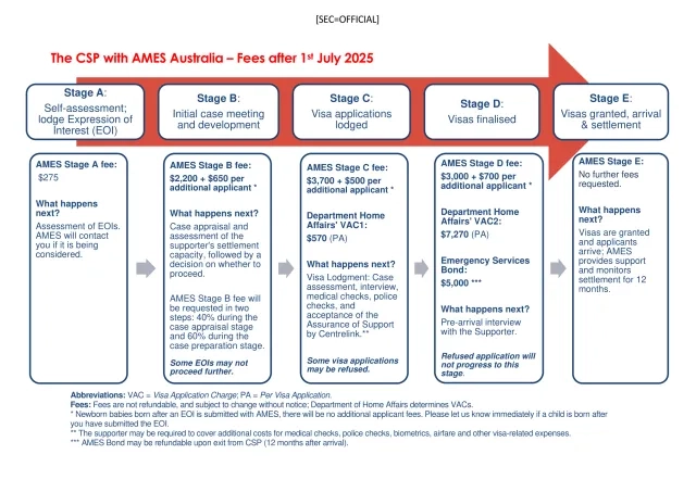 Only a certain number of visas are granted under the Community Support Program (CSP) every year. The CSP has extended processing times as it is heavily oversubscribed. Processing may take eight years or longer. All applicants should expect lengthy processing times. To help manage this, the Department has asked APOs to pause accepting Expression of Interests (EOI) and lodging new visa applications until 31 January 2026.